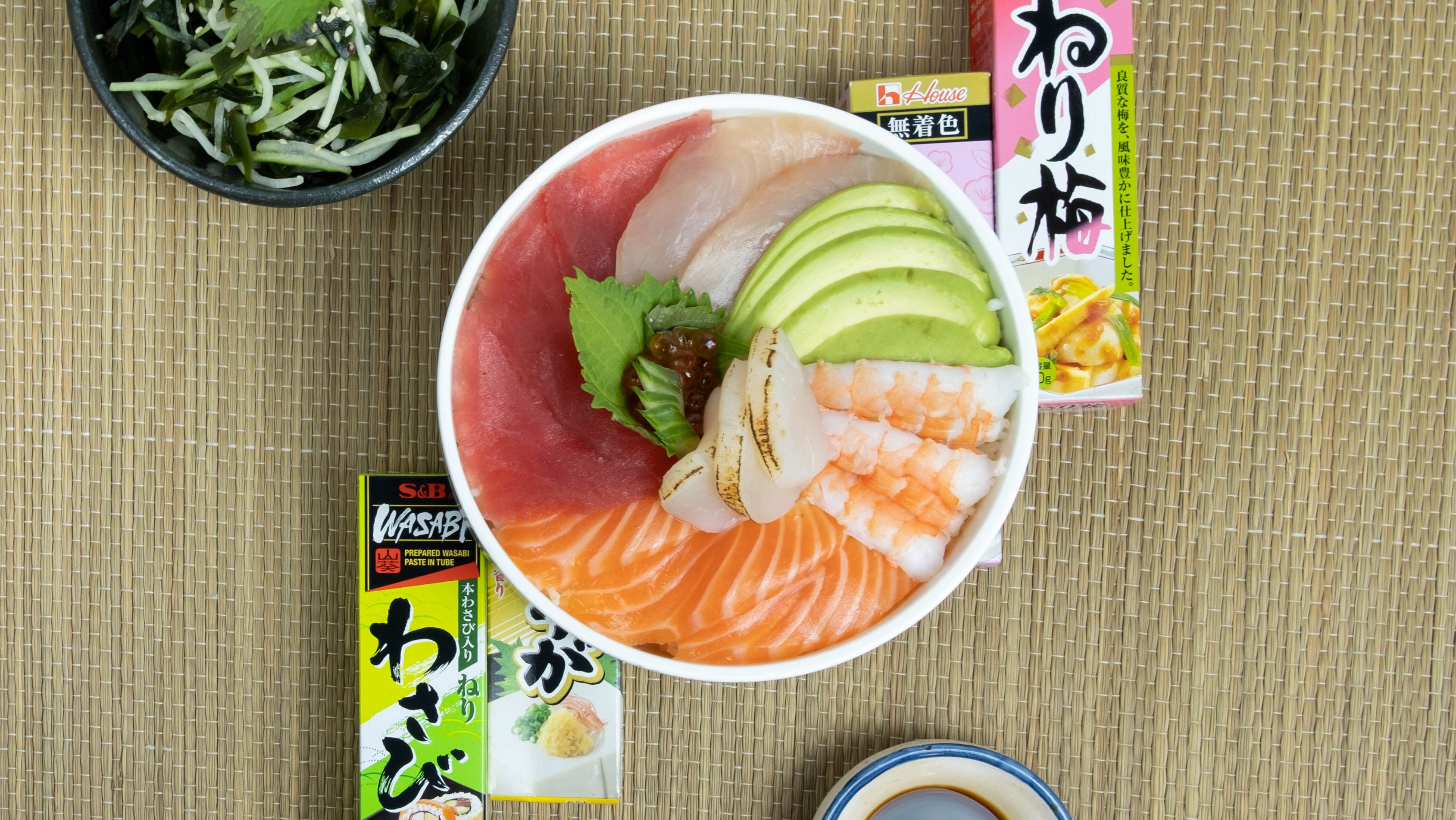 Bol de riz recouvert de poisson cru et de diverses crudités